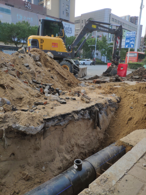 最后我們來到了槐蔭大道與北京路交接處,由于槐蔭大道全線施工改造,位于北京路交接處的供水管道需要向外遷移,現(xiàn)場挖掘機,熱熔機一齊開動,各部門通力合作,密切配合,各司其職,各負其責,一節(jié)一節(jié)地推進,把工作做實做細。